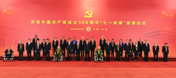 建党百年之际,党中央决定授予29名同志“七一勋章”。“七一勋章”是中共中央决定、中共中央总书记签发证书并颁授的党内最高荣誉,这次颁授系首次。颁授仪式由中共中央政治局常委、中央书记处书记、党和国家功勋荣誉表彰工作委员会主任王沪宁主持。