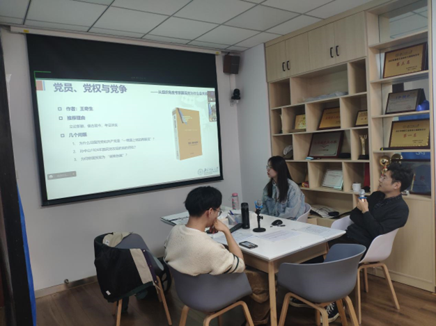 随后进行了“喜迎二十大,永远跟党走”系列读书会。刘壹果推荐了《苦难辉煌》一书。本书对20世纪二三十年代的中国的历史进程进行了剖析,展现了中国共产党领导人民进行革命战争的正义、艰辛和伟大。王浩源推荐了《党员、党权与党争》。本书借古观今,考证翔实,图表丰富。兰松推荐了林毅夫的《解读中国经济》和视频《中国经济专题》。
