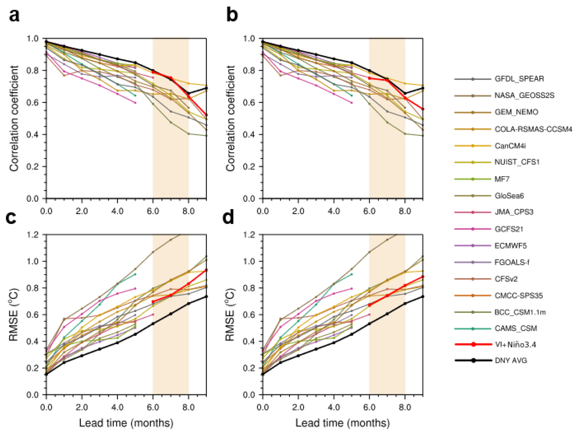 图2: 1994-2016 年期间,Niño3.4 指数异常超过 0.5 °C 的情况下观测与预测值之间的相关系数和均方根误差 (RMSE,°C)。(a,c)每条细线代表单个动力模型结果,红粗线表示我们基于滑动建模构建的VI + Niño3.4模型的结果。粗黑线表示当前 16 个动力模型集合平均的结果。 (b) 和 (d) 同 (a) 和 (c) ,不同的是 VI + Niño3.4 模型的预测结果是通过留一法计算得出的。