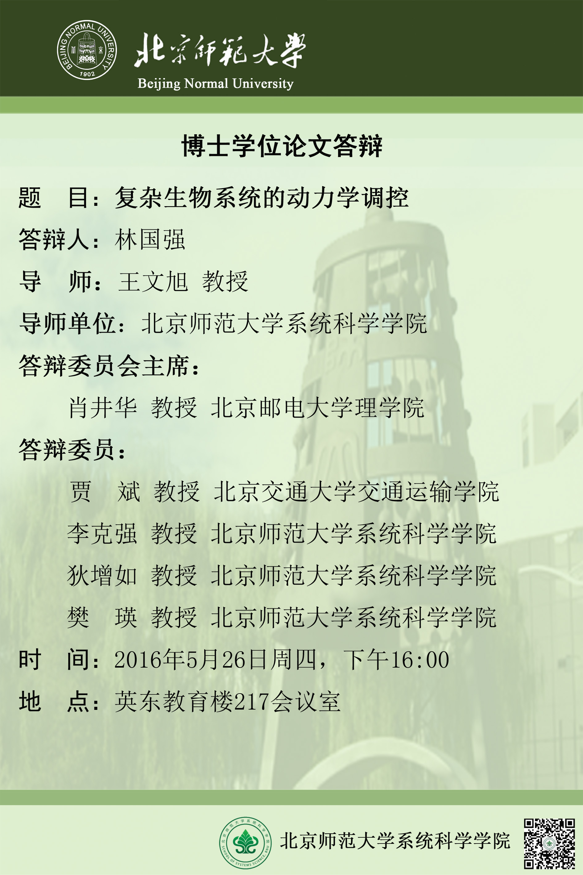 [博士答辩] 复杂生物系统的动力学调控