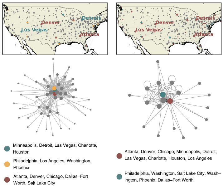 美国机场网络(不包括阿拉斯加区域)是一个具有超过五百个节点的网络,研究人员依据经过机场的航线数量(即机场节点的度数)对机场进行排序,并展示将其中的前15个机场被纳入了哪些宏观节点。可以发现,当将原始网络粗粒化为50个节点的宏观网络时(左列),这些大机场都被纳入了3个宏观节点上,而当进一步压缩网络尺寸为20个宏观节点时(右列),可以发现宏观节点也被进一步合并为两个。这说明这些大度节点都被纳入了少量宏观节点中。