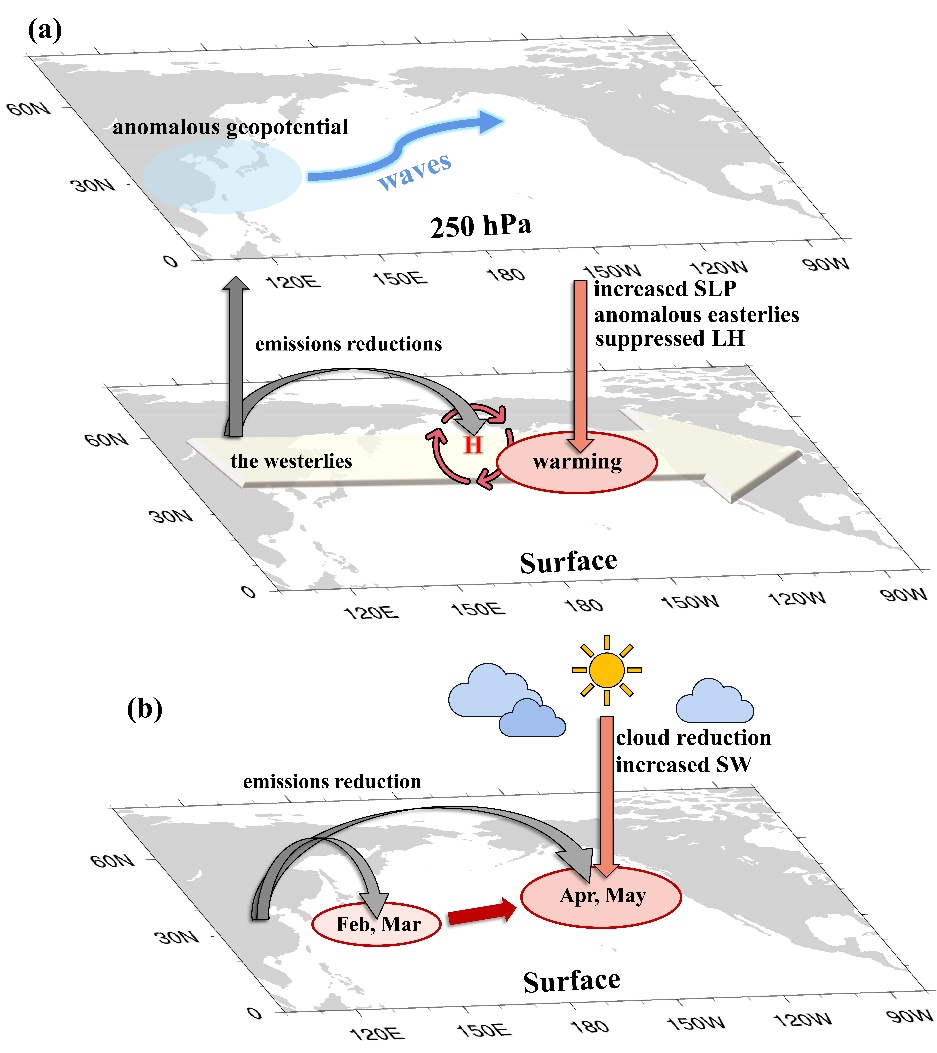 2020年春季,北太平洋发生了破纪录的海洋热浪事件(图1),对海洋生态系统产生了重要的影响。同一时期,新型冠状病毒(COVID-19)爆发,新冠疫情期间人为产生的气溶胶排放量明显减少,其对北太平洋海洋热浪的影响还并不清楚。 av影片直播 夏炎副教授及其合作者基于地球系统模式模拟和观测数据,系统性研究了COVID-19期间气溶胶减排对2020年春季北太平洋热浪的贡献,揭示了气溶胶排放变化对北太平洋海洋热浪的影响机制。