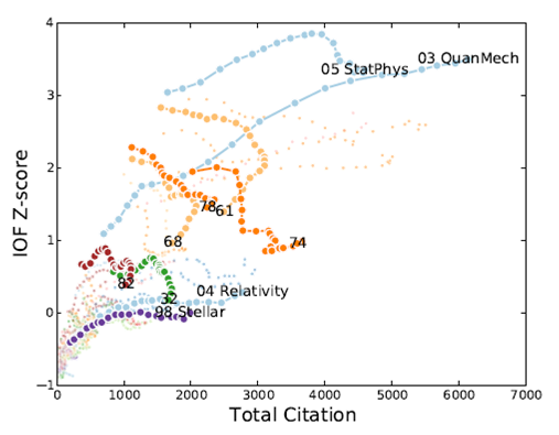 1991至2011年间物理学子领域相对重要性(IOF-Z Score)与引用次数(Total Citation)随时间的演化轨迹。