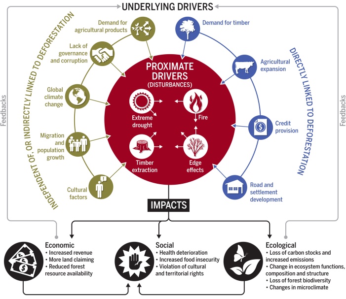 作为当今世界上保存最原始的热带雨林,亚马逊雨林对地球气候、生物多样性、当地福祉和生计以及整个人类未来至关重要。然而,人为干扰导致现存的亚马逊雨林退化程度远远超过科学家之前的预计,这种退化已经威胁到亚马逊雨林的未来。高达38%的亚马逊雨林面积(相当于英国面积的十倍),由于受到人类活动的干扰,其碳排放量已经达到甚至超过了森林砍伐造成的碳排放量。导致亚马逊雨林退化的人为干预活动,是一系列广泛性的驱动因素相互作用的结果。这些潜在的驱动因素在本质上相互关联,在多尺度上相互反馈,其所产生的影响无论在生态环境层面还是社会经济层面都具有高度复杂性。