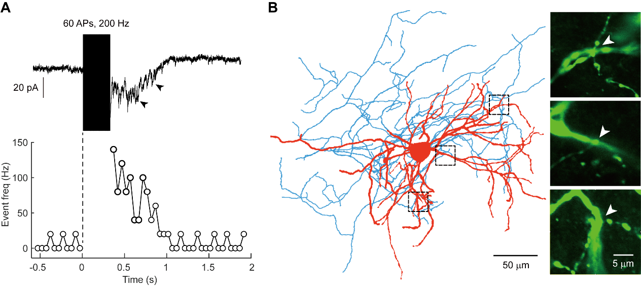 近期, av影片直播 王大辉教授团队博士生王轩与复旦大学脑科学转化研究院舒友生教授团队合作,结合神经科学的实验技术和神经系统的计算模拟,对纹状体神经元的自突触进行了深入探索。在急性分离的小鼠脑片上,研究人员对纹状体神经元进行全细胞记录,利用动作电位高频爆发后自突触上延迟出现的神经递质非同步化释放(asynchronous release, AR)现象来识别记录的神经元是否具有功能性自突触。惊讶的是,所有记录到的SPN在动作电位爆发后都没有自突触的AR现象,即使是在细胞外液中存在促进AR的锶离子(Sr2+)的情况下也没有出现AR,提示SPN并没有发育出自突触结构。相反,在另一类纹状体神经元,即小清蛋白(Parvalbumin,PV)阳性的中间神经元上,我们在约半数的记录细胞中观察到了稳定的自突触AR事件(附图A),同时在形态学上也观察到了可能的自突触位点(附图B)。