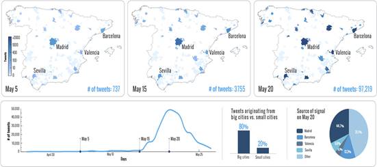 Spain’s 15M protest growth in time shows that the protest did not transcend the online sphere until May 15 when the political movement emerged on the streets. Broadcasting traditional media started reporting about it soon after; by that time, demonstrations had been held in the most important cities of the country.