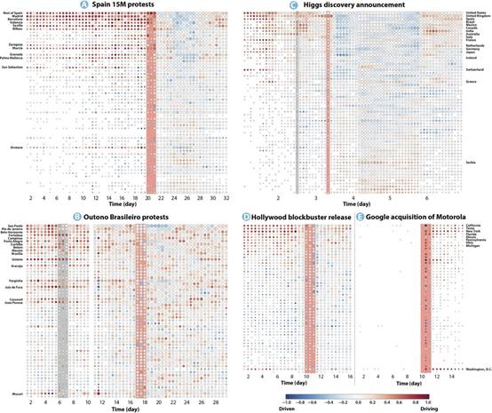 该方法可以捕捉到群体社会现象中出现的系统动力学,并对五组推特中来自五个知名社会事件的数据做了分析(好莱坞著名电影的发布、两个大规模的政治抗议、希格斯玻色子的发现、谷歌收购摩托罗拉)。文章中发掘出了两个尺度的相变:一是时间尺度(快或慢),标志着事件的产生;另一个是有向网络中不同的社会单元之间的影响力从无序到有序的相变;该项研究为在开源信息中获取社会事件的分析提供了一个很好的模型和预测算法。但是并不能和潜在的社会事件的预测混为一谈,只是提供了一个很好的技术帮助,比如网络变化节点的检测等。与此同时,这方法对如何在类似的社会事件中分析信息动力学的相变现象提供了有价值的帮助。