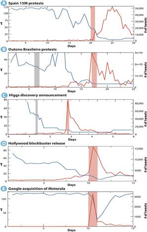 (A to E) The panels report the variation of the characteristic time scale (blue) that maximizes the STE flow as the social event is approached. Red lines correspond to activity volume (number of tweets). Light red vertical lines correspond to the onset of the main social event. Gray vertical lines (B and C) indicate a smaller precursor event. (A) The 15M event shows a progressive decline of the characteristic time scale well before the actual social event; the same is observed for the Outono Brasileiro in (B) (note a data blackout between days 10 and 11). The patterns for the Higgs boson discovery data set in (C) and the Hollywood blockbuster data (D) also reveal a drop in the characteristic time scale, although this is smoother in the movie case. Overall, in (A) to (D) (endogenous activity), the time scale has already dropped to 50% by the time the absolute volume signals a system-wide event. Finally, the Google-Motorola deal triggers a high volume of microblogging activity without actual change in the time scale of the information flow (E). In this case, the decline is observed in the aftermath of the announcement. As discussed in the main text, this event is the only one that is clearly elicited by an exogenous trigger.