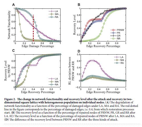 简介:基础设施网络是现代社会的一种重要的实际系统,它的安全性一直是各领域研究者关注的问题。在复杂网络的研究中,很多已有工作对于网络的抗毁性进行了研究。这些工作基本都是研究网络遭受随机攻击和蓄意大度攻击时的影响。然而,还有一些真实情况,网络遭受的是局域式的攻击,例如地震和台风对交通网络(公路和铁路网等)的破坏。本文研究了在网络受到局域攻击后的修复问题。我们发现虽然局域攻击对网络的破坏程度比蓄意大度攻击小,但是它的修复更为困难(即难以通过修复少数节点大幅度恢复网络功能)。为解决此问题,我们提出了两种针对局域攻击的网络修复策略。这两种策略能比随机修复更有效的恢复网络功能,其效果接近贪婪算法。本文的相关结论不仅在模型网络上验证,并且在海南岛公路网络结合台风和地震攻击数据上也得到了验证。