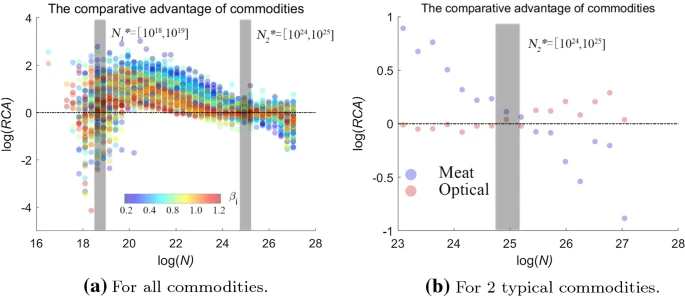 近期, av影片直播 陈清华教授团队与经济与工商管理学院蔡宏波教授合作,基于1995年至2015年的联合国商品贸易统计数据,系统地分析二十年来世界各国贸易结构与经济增长的演化关系,并尝试探究全球贸易网络的整体性演化规律和各国商品结构的一般性升级路径。在理论分析中,该团队使用显性比较优势(Revealed Comparative Advantage, RCA)来描述全球贸易网络中各个国家在不同类商品上的优势特征,并结合对商品规模特征(scalecharacteristics)的假设,得到描述RCA演化的状态方程,这有助于分析各类商品的比较优势随经济规模(N)和商品技术含量(β)的演化规律。通过对状态方程求解得到两个鞍点,并且,世界200个国家商品贸易统计数据也验证了这两个鞍点的存在(图1),从而揭示了二十年间全球贸易中比较优势演变的若干统计性规则。