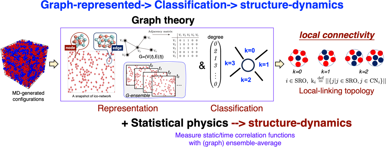 图1. 无序系统结构图表示示意图。这里关注的并非是静态拓扑图上的动力学过程,而是反映实际液体结构演化特征的、基于集合平均的物理动力学行为。在本研究中所采用的图为无向无权图,节点的度为其邻接节点的数量。