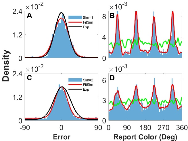 近期, av影片直播 王大辉教授团队,通过神经动力学建模与数值模拟,揭示了聚集报告现象与报告偏差分布的可能神经动力学机制。团队成员利用环状神经元网络,将不同颜色便好的兴奋性神经元按照偏好特征放置在圆环上,表征色环上相应角度的颜色。研究发现当兴奋性神经元之间的突触连接为异质性,且这些突触连接具有短时可塑性(Short-Term Plasticity),网络模型可以较好地复现出实验中的现象。如附图A,C所示,模型所得到的报告的偏差分布(蓝色柱状图)是高斯形的,且与实验分布(黑线)接近。附图B,D表示报告分布(蓝色柱状图)呈现出明显的多峰特征,偏离了刺激的均匀分布(绿色曲线)。