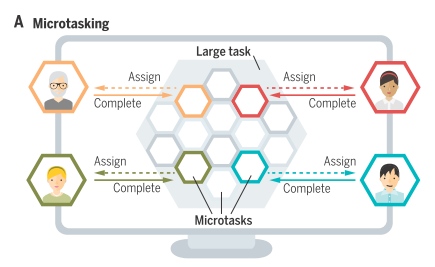 对此,面向未来的人类计算的生态系统(如图C所示)具有极大的潜力。典型的例子有辅助证明一个有80年历史的数学难题的Polymath Project项目,还有面向大众的精细化新闻制作系统ePluribus Problem Solver。在这两个例子之中,人们串联起来,各自独立的工作,从群体社区中获得新奇的观点,及时地交流思想创造出新的知识。