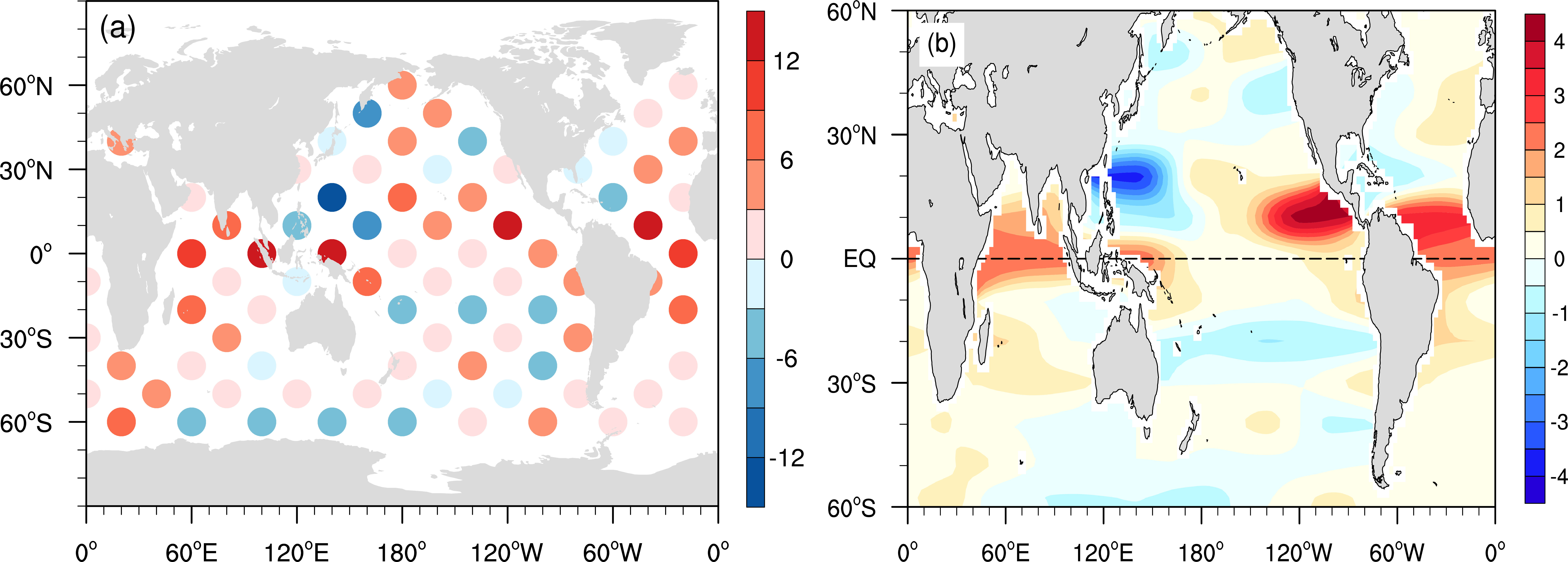图2. WBI对海温扰动位置的敏感性图。(a)与图1类似,此处圆点颜色代表了WBI响应强度。单位为°E K-1。(b)精细化计算后得到的WBI对单位网格框海温升高1 K的响应。单位为10-2 °E K-1。正(负)值代表海温升高引起WPSH西伸(东退)。
