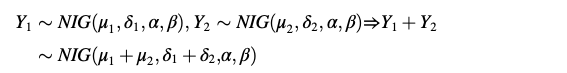 NIG分布作为广义双曲分布(GH)簇的一员,能够较好地对具有厚尾性的对称或非对称分布进行建模。但它显著区别于其他常用分布的地方在于其参数的半可加性。具体地,多个独立随机变量的卷积之下NIG分布是闭合的,多个独立随机变量之和对应的NIG分布中,尺度参数和位置参数可由单个独立随机变量的对应参数加总得到,即: