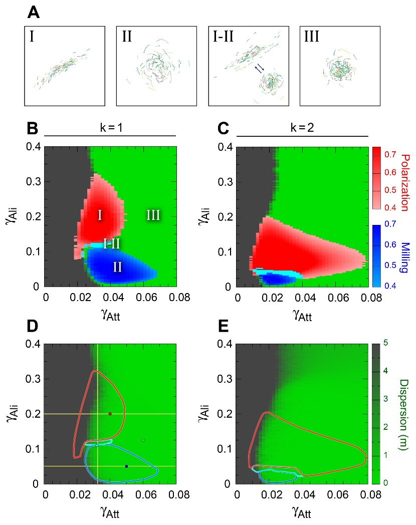 近期, av影片直播 韩战钢教授团队博士生王伟嘉与法国图卢兹三大Guy Theraulaz教授合作,基于红鼻剪刀鱼(Hemigrammusrhodostomus)数据驱动模型对鱼类认知和环境感知能力与集群运动状态的联系进行了深入研究。该模型由红鼻剪刀鱼运动轨迹数据重构得到,完整描述了“加速—滑行”(burst-and-coast)运动模式下个体间的社会性相互作用以及多源信息整合方式。在此基础上,该研究系统分析了相互作用策略、相互作用强度与范围、个体行为随机波动以及群体规模对鱼群协同运动能力的影响。研究发现,当群体在吸引作用下保持聚集时,1至2个最有影响力邻居的方向信息即可使群体实现协同运动;一致性游行与同向环绕的形成则依赖于方向对齐作用。其次,相互作用强度与范围对集群运动状态的影响等价,其持续增加并不意味着聚集程度与协同能力的提高,过强的相互作用将使群体进入蜂拥状态。此时社会性相互作用与行为随机波动的作用相同。最后,群体在不同规模下均可形成稳定的集群运动状态。
