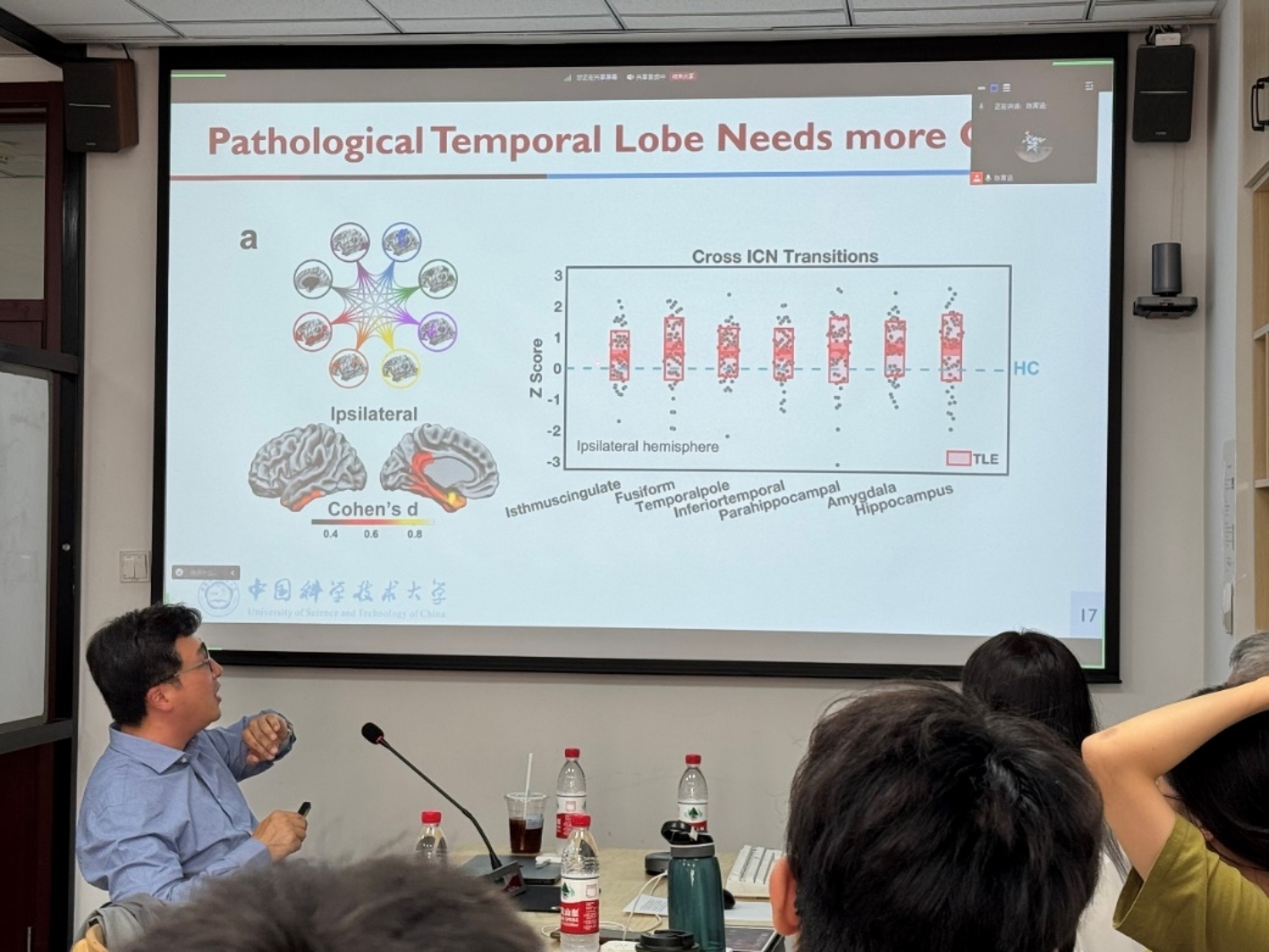 2024年9月25日, av影片直播 脑与认知方向首次师生研讨会顺利开展。本次活动有幸邀请到来自中国科学技术大学生物物理学博士、心理学系特任研究员、博士生导师何晓松研究员来为学院从事脑与认知方向研究的老师和同学们进行了题为《网络神经科学在癫痫手术中的应用:从功能磁共振视角得到的启示》的交流报告。何晓松研究员主要从事运用多模态脑成像和网络神经科学方法分析癫痫发病机制和预后方面的研究,其以第一作者的身份在Science Advances,Brain,Neurology等期刊发表论文40余篇。何晓松研究员基于功能磁共振数据、结合网络科学的方法,在分析难治性颞叶癫痫的治疗方案、临床风险、手术预后等方面积累了丰富的研究经验。学院脑与认知方向的王大辉老师、陈育涵老师、廖旭红老师、邵宇秀老师,以及相关方向的多位博士、研究生同学,一同参加了此次活动。