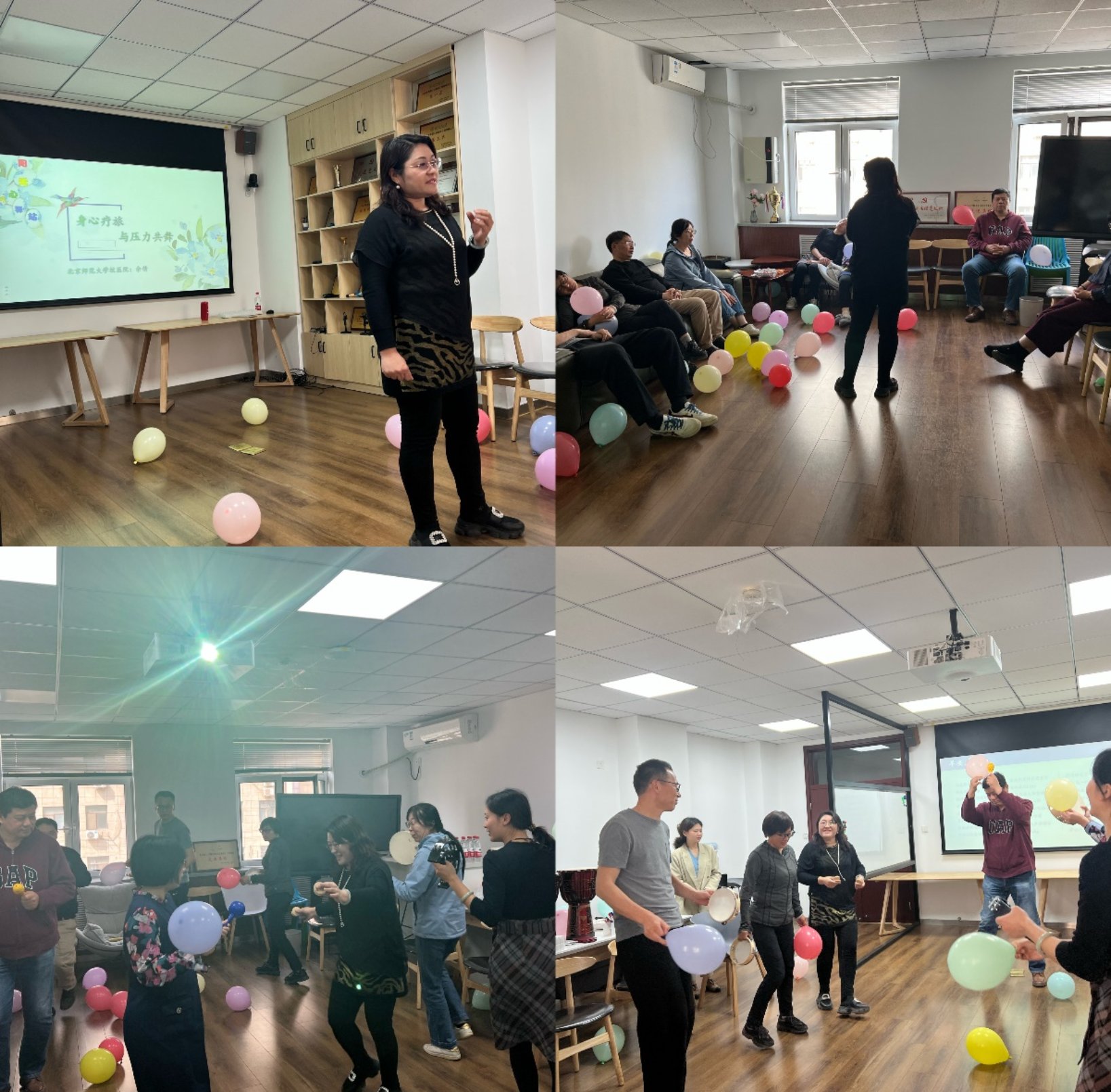 活动开始,大家将当下感受到的压力源写在纸条上并放入魔法气球中。随后,伴随着悠扬的音乐,在余倩大夫的引导下,老师们闭上去沉浸感知。在简单的焦虑问卷自测环节,大家纷纷谈到了自身不同程度的焦虑问题。针对这些问题,余倩大夫带领大家体验了正念“葡萄干”和“正念观呼吸训练”两种形式的缓解方法,切身体会到了多感官、沉浸式的放松状态。最后,伴随着欢快的音乐,在场老师开始翩翩起舞,欢声笑语,彻底将压力放飞。