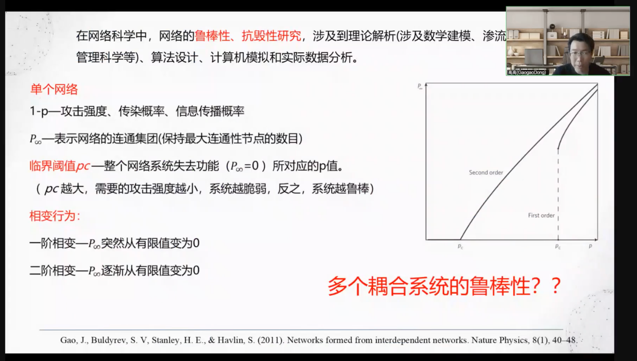 2022年10月11日下午15:30,江苏大学数学科学学院的董高高副教授在教八205教室做了题目为“广义复杂网络下的级联行为及中微观尺度下的网络鲁棒性分析”的报告。董高高老师分享了实际系统非均匀的异质耦合模态的级联行为的理论表达,发现当广义的耦合网络系统存在着最佳的耦合结构。讲座由 av影片直播 樊京芳老师主持,现场有 av影片直播 近90位师生参与了讨论。