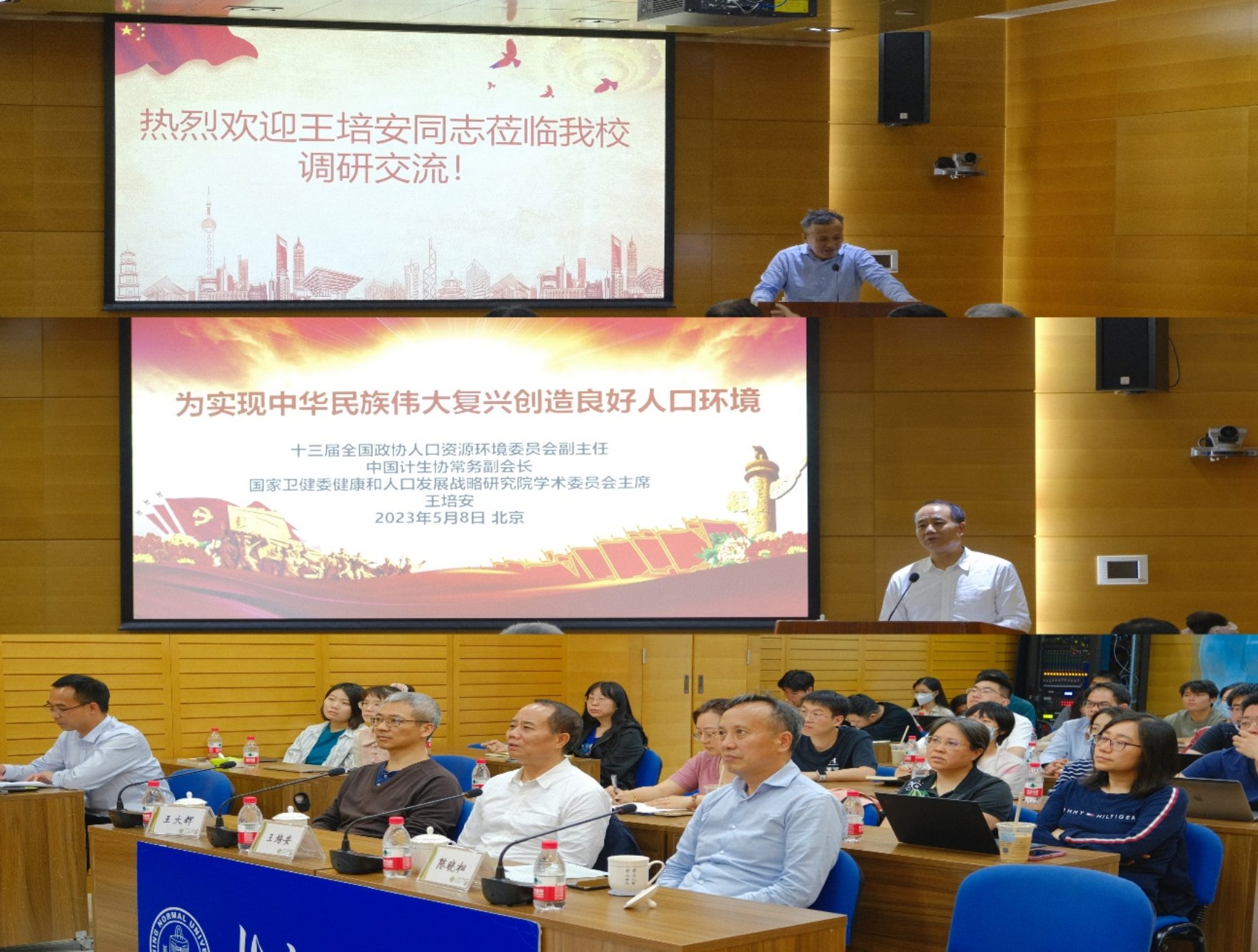 2023年5月8日,学院邀请到十三届全国政协人口资源环境委员会副主任、中国计生协常务副会长、国家卫健委健康和人口发展战略研究院学术委员会主席王培安在京师学堂进行了一场以“为实现中华民族伟大复兴创造良好人口环境”为主题的专题报告。本次报告由学院院长陈晓松主持,现场多名师生积极参与此次活动。