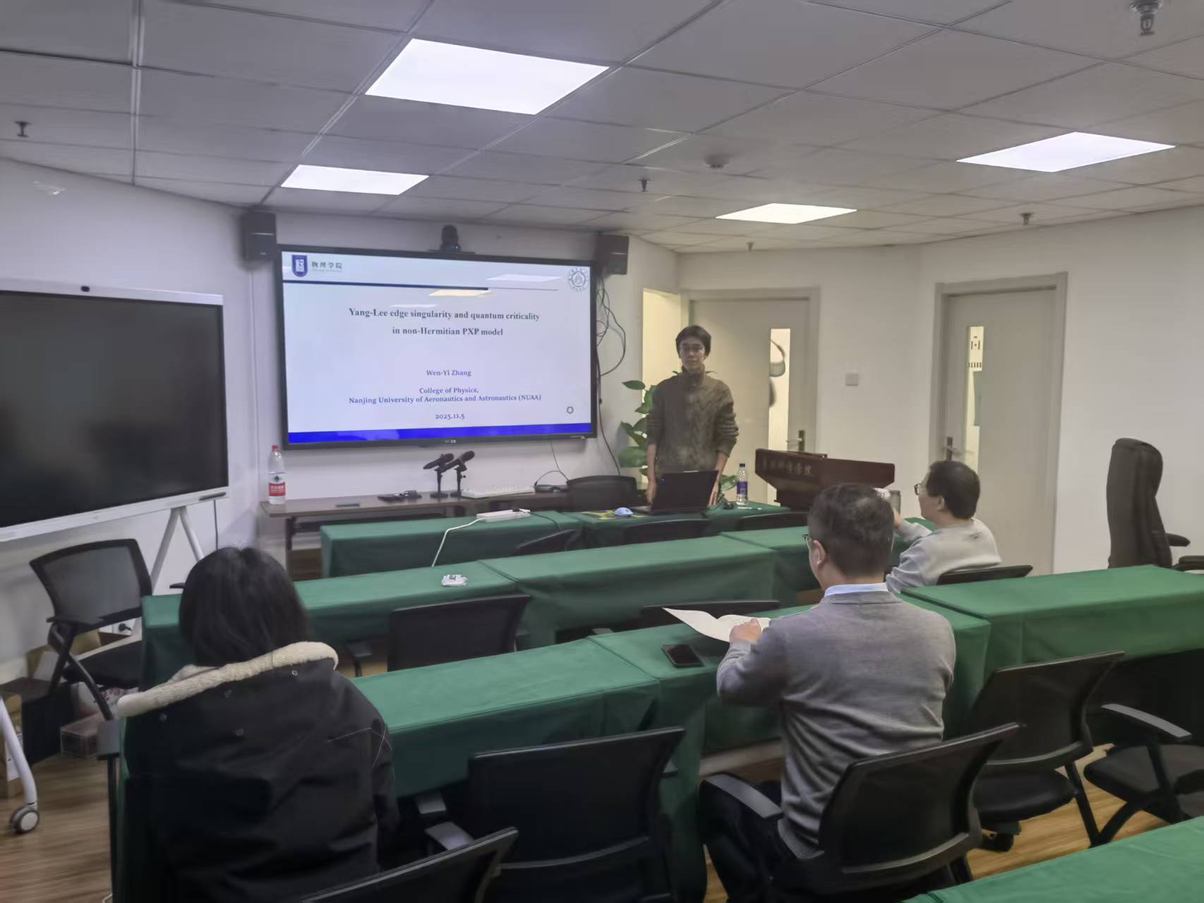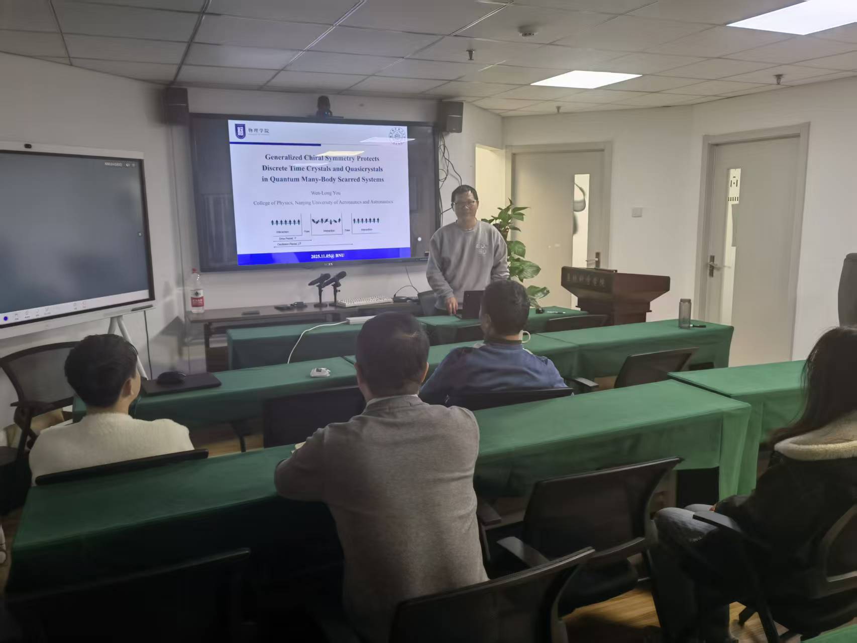 近日,复杂量子系统研究专家南京航空航天大学物理学院尤文龙研究员及其团队优秀博士研究生张文乙同学应邀来访 av影片直播 ,围绕量子复杂系统领域开展学术交流,并于2025年11月5日上午和下午为全院师生作了专题讲座。