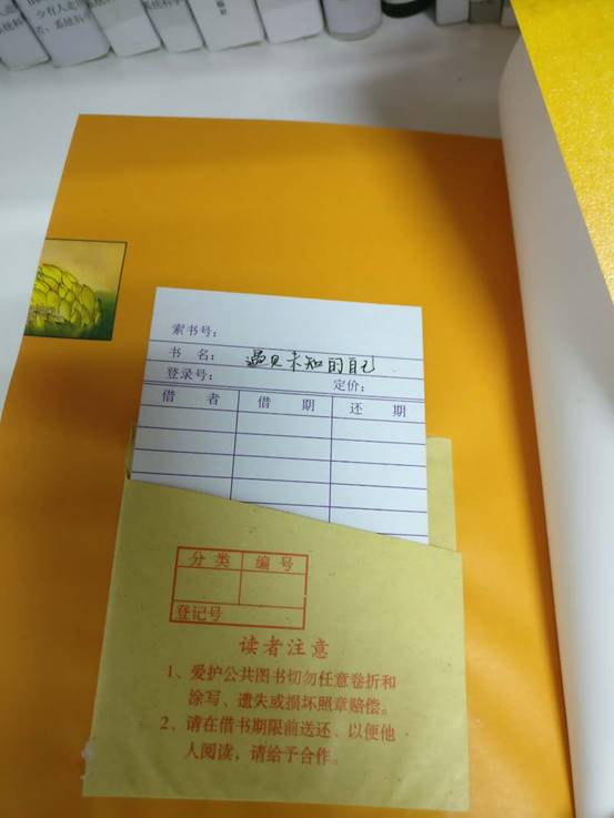 3. 还书时,先在铁盒中找到该书籍的借阅卡,在相应位置填好还书日期后,将借阅卡插回图书最后一页的卡槽中,将图书归还原位即可。