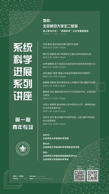 为提升研究生学术视野,辅助学院培养复合型人才,学院学生工作执委会学术部(简称学术部)于10月中旬牵头举办了“系统科学进展”系列讲座活动。经学院推荐,学术部积极协调,目前讲座已邀请到 av影片直播 从事系统科学研究的优秀青年教师,他们会结合系统科学学科的前沿课题展开报告,欢迎广大师生参与,期望大家在思想上碰撞出精彩火花!