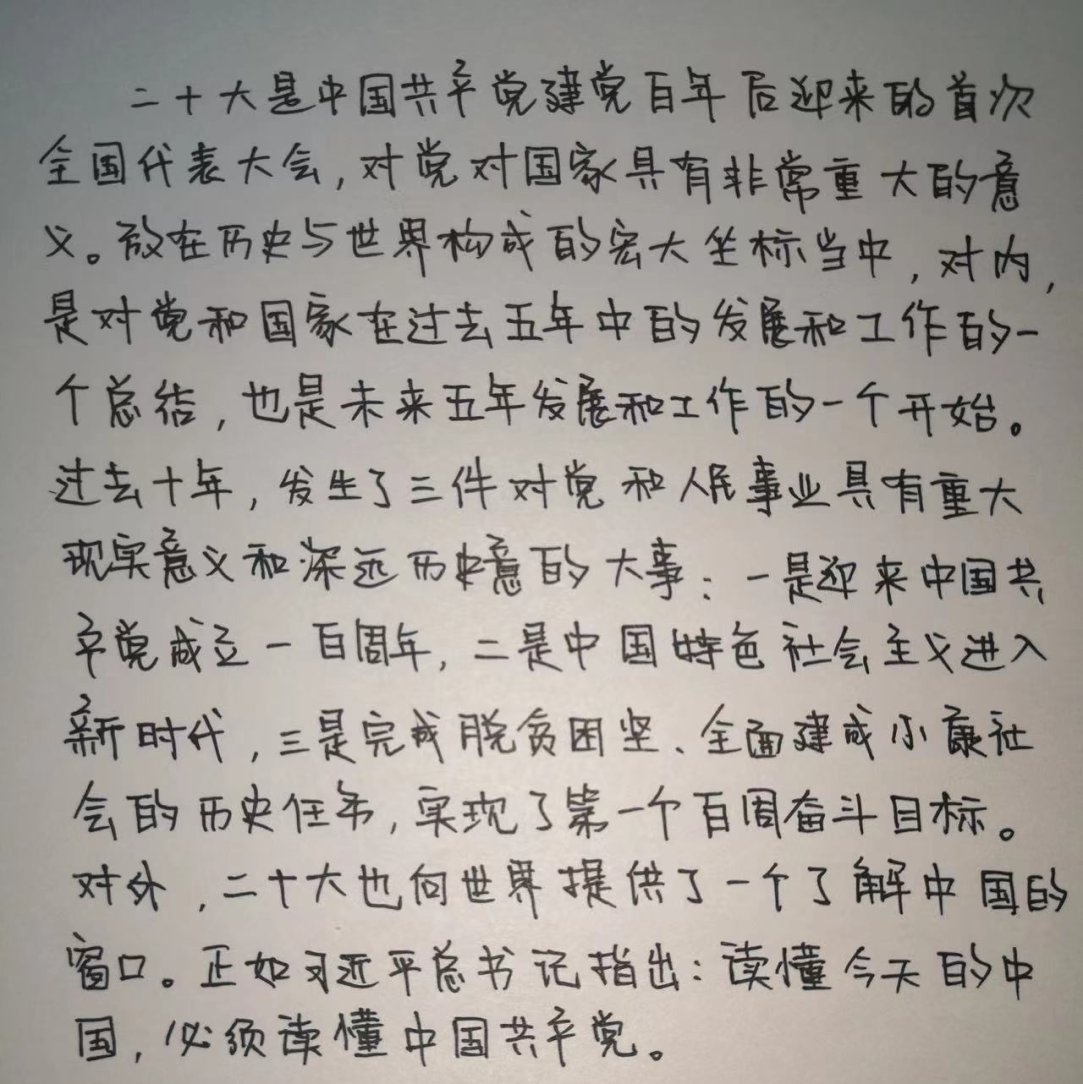 最后,同学们交流了此次学习的体会,并以手写的形式留作记录。大家表示此次活动加深了自己对二十大精神的理解,同学们将认真学习不负韶华,不负这个大好的时代,踔厉奋发,勇毅前行。