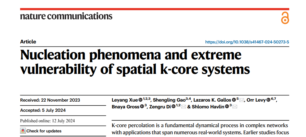 该研究成果7月12日被《Nature Communications》杂志接收并发表,题为“Nucleation phenomena and extreme vulnerability of spatial k-core systems”。研究工作是av影片直播 系统科学学科作为第一单位,与以色列巴伊兰大学等多家学术单位合作完成的。复杂系统国际科学中心、 av影片直播 的博士生薛乐洋同学为论文第一作者,美国罗格斯大学的Lazaros Gallos教授、以色列巴伊兰大学的Shlomo Havlin教授以及av影片直播 的狄增如教授为论文的共同通讯作者。