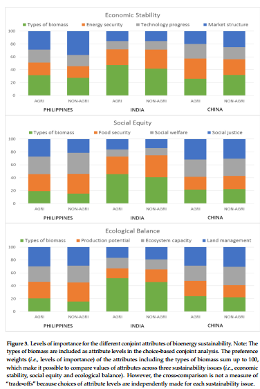 in the Philippines, India and China. It acquired general perceptions of the people by asking them (a) specific questions about their level of familiarity with bioenergy; (b) relationship of their work to bioenergy; and (c) their opinion on contribution of various feedstock on the economy and impact of bioenergy production on food security. In addition to these questions, we estimated preference weights of various feedstock based on the conjoint choices on bioenergy’s contribution to social stability, social welfare and ecological balance. The estimates revealed significant trade-offs not only among these three dimensions of sustainability but also the relative importance of energy security, food security and ecosystem capacity to other economic, social and environmental objectives. The types of first generation feedstock that are currently used for biofuel production in the respective countries and those that offer alternative household use are perceived as important to the economy and preferred bioenergy feedstock. Based on the results of the study, the preferred role of bioenergy for sustainable development reflects the social and economic concerns in the respective Asian countries, e.g., energy security in China, food security in India, and ecosystem degradation in the Philippines.