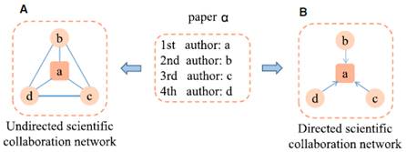 在科学学研究领域中,如何测度科学家影响力是一个重要的主题。已有研究中一种途径是通过科学家合作网络来进行。传统科学家合作网络是无向网络,如果两名科学家共同合著过一篇论文,则在他们之间添加一条连边。然而这种网络忽略了科学家对于合作论文贡献力的不同,所以我们考虑了一种简单的科学家贡献力分配的情况,即将一篇论文的作者划分为两类:重要贡献者(第一作者、通讯作者)和非重要贡献者,并构建了一种由非重要贡献者指向重要贡献者的有向科学家合作网(如下图):
