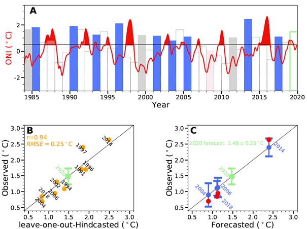 对于刚刚到来的2020年,基于文中提出的System Sample Entropy的方法,作者们预测厄尔尼诺将有很大概率会在本年下半年再次发生,并发展为一个中等强度甚至高强度的厄尔尼诺事件,其预测强度为1.48+-0.25摄氏度。