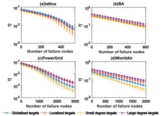 Fig. 2. The dependence of transportation efficiency of four kinds of targets (i.e., globalized targets, localized targets, small degree targets and large degree targets) on the number of failure nodes (random attacks) in different networks (logarithmic coordinate in Y axis).