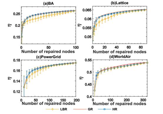 ). We consider seven recovery methods: degree recovery (DR), betweenness recovery (BR), local betweenness recovery (LBR), k-shell recovery (KR), random recovery (RR), greedy recovery (GR), hybrid recovery (HR).