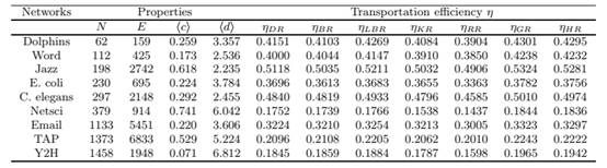 Table 1. The basic structural properties of real networks, and their transportation efficiency η when 20% repaired by different recovery methods. Structural propertes include network size (N), edge number (E), clustering coefficient (