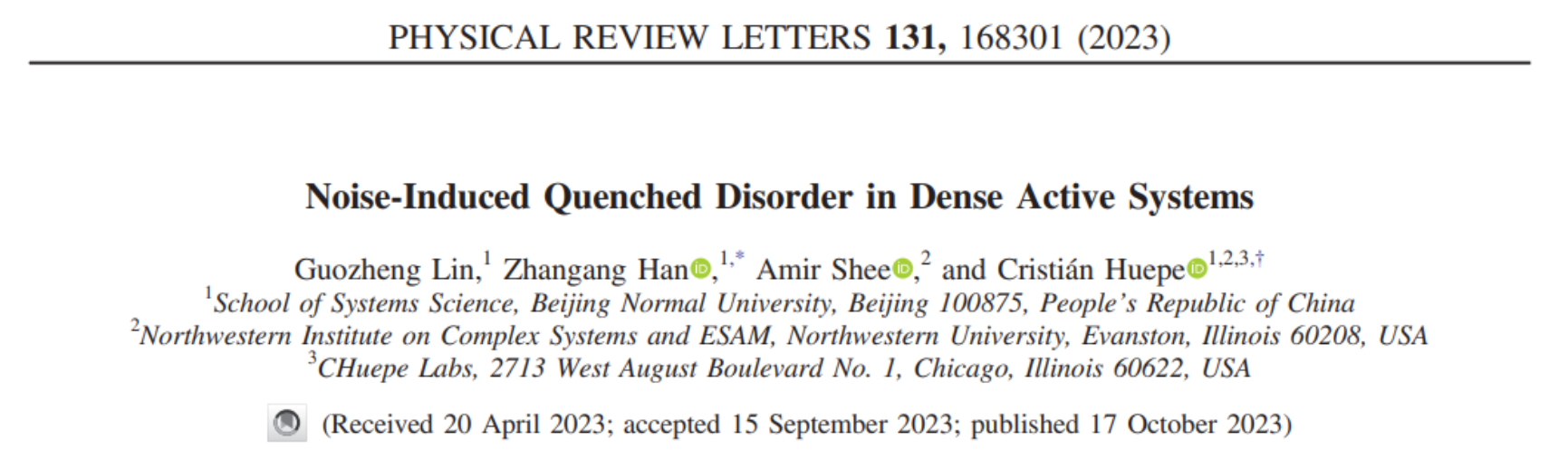 近期,Physical Review Letters 期刊发表了题为“Noise-Induced Quenched Disorder in Dense Active Systems”的论文(如图1所示),发现由相互排斥的个体组成的密集集群系统能够产生一种新的淬火无序态 (Quenched disorder),该状态展现出短程的有序和长程的无序,与在复杂系统中被长期研究的自旋玻璃态类似。该论文以 av影片直播 为第一单位,由 av影片直播 韩战钢教授作为通讯作者、林国政博士作为第一作者,联合了美国西北大学的 Cristian Huepe 研究员(共同通讯作者)和Amir Shee 博士后,于 2023 年 10 月 17 日上线于 Physical Review Letters 期刊官方网站。