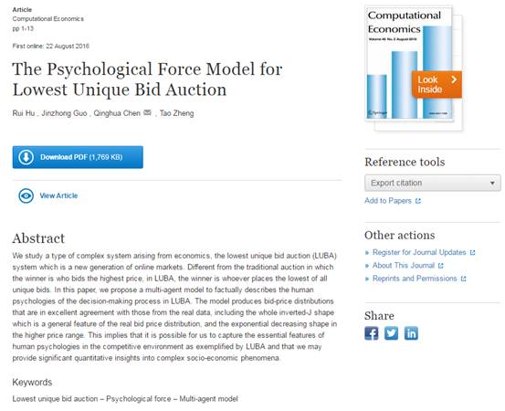 4 Hu R, Guo J, Chen Q, et al. The Psychological Force Model for Lowest Unique Bid Auction. Computational Economics, 2016()