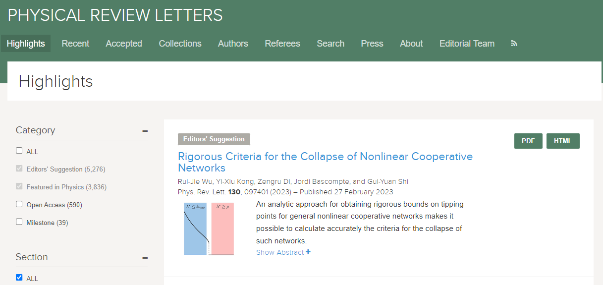 研究成果以“非线性合作网络崩溃的严格判据”(Rigorous criteria for the collapse of nonlinear cooperative networks)为题,于2023年2月27日被物理学顶级期刊《物理评论快报》(Physical Review Letters)接收发表,并被选为编辑推荐(Editors' Suggestion)在期刊主页高亮展示。研究工作主要在国家自然科学基金重点项目(批准号:71731002)的资助下完成。av影片直播 复杂系统国际科学中心吴蕊洁博士为论文的第一作者,史贵元副研究员为论文的通讯作者。av影片直播 珠海校区为论文的第一完成单位和通讯作者单位。
