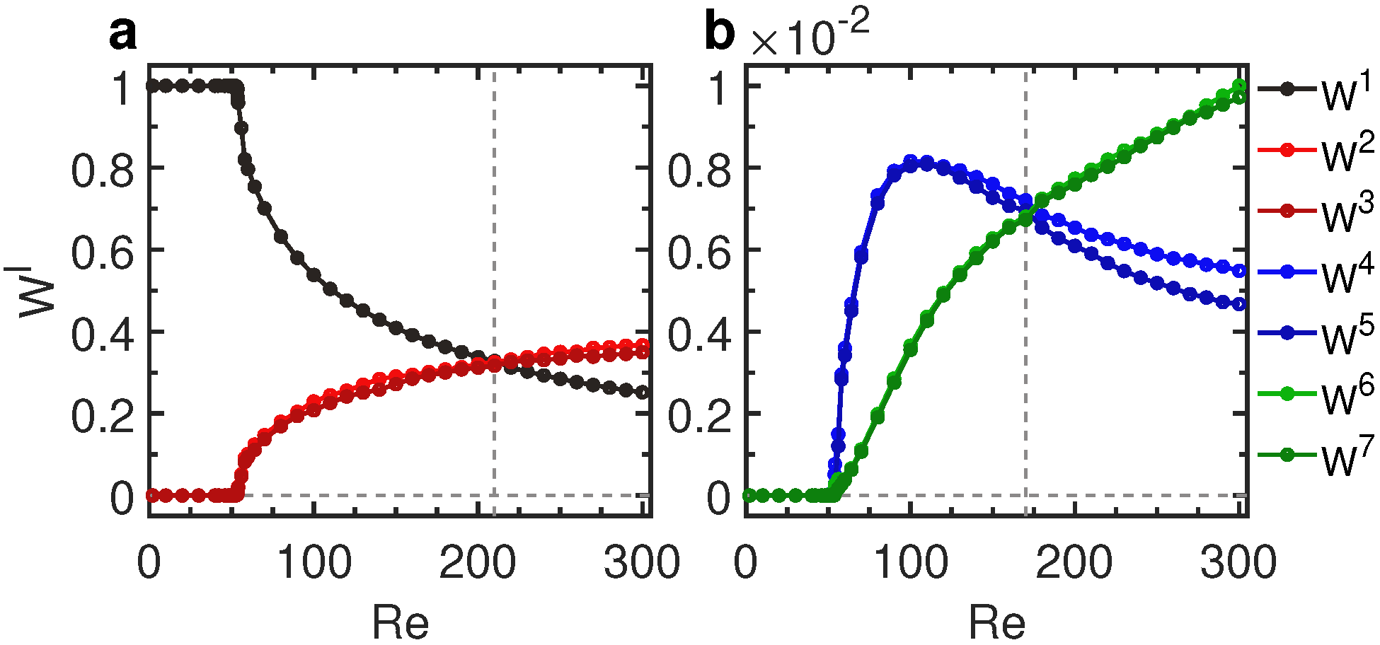 = 0处包含了灰色虚线。注意,在(a)和(b)的交叉点处,系统的主导本征微观态发生了变化,分别对应于Re = 210和Re = 170。