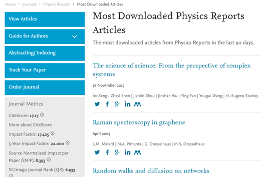 av影片直播 曾安副教授团队2017年11月16日发表在Physics Reports杂志上的综述文章:《The science of science: From the perspective of complex systems》自从年初以来超越该杂志所有发表的论文,荣登3个月内下载量榜首,成为该网站最受关注的文章。