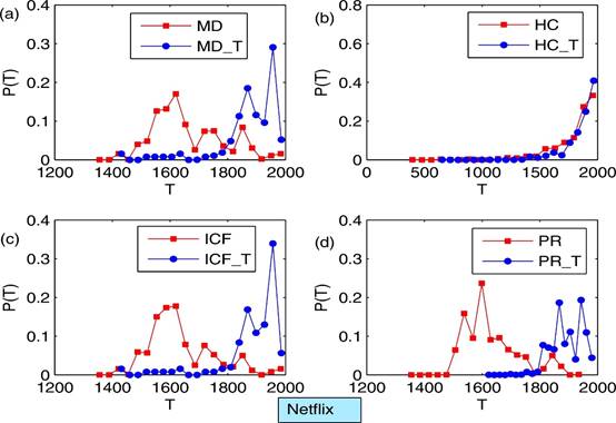 Fig. 5. (Color online) The distribution of Tα in users’ recommendation lists when different recommendation algorithms are applied. The method marked with “T” is the timeliness-based version of the method. The network data used in this figure is Netflix.