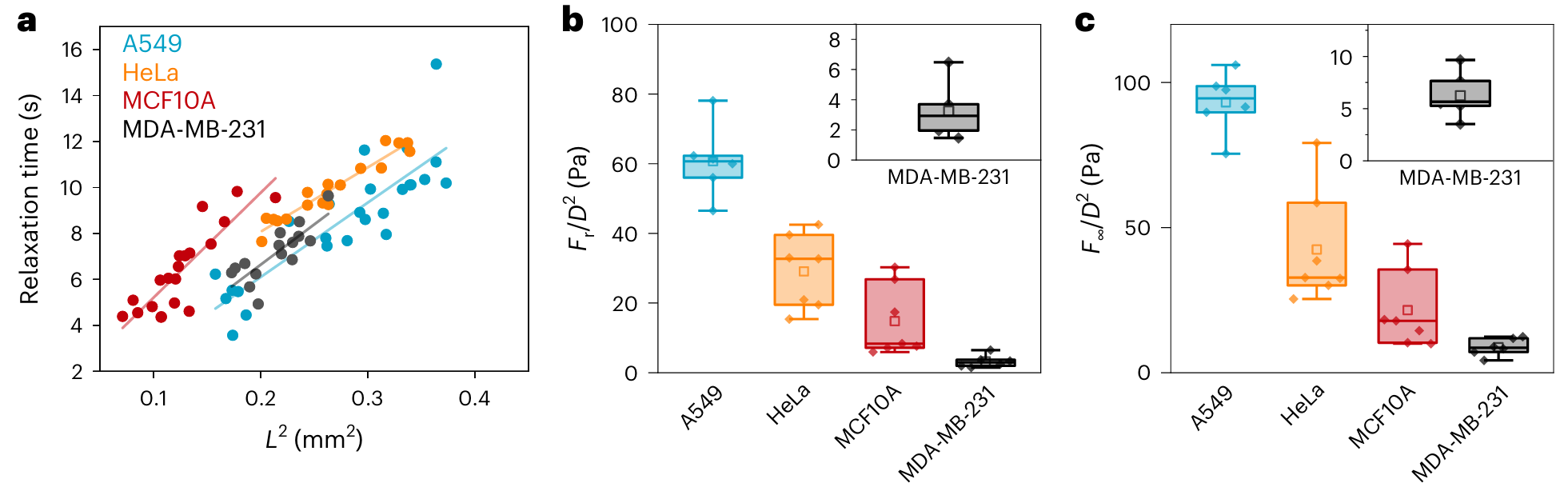 研究团队首先通过力学实验和有限元模拟,明确了区分多孔弹性和粘弹性两种行为的关键物理判据。这两种力学模型的关键区别在于:力学松弛时间是否依赖样品尺寸。粘弹性材料的松弛时间依赖于材料本身的粘滞系数和弹性模量等内禀属性,与样品大小无关;而多孔弹性材料的松弛则源于内部流体的流动,因此松弛时间会随样品尺寸的增大而变长。实验结果清晰地表明,无论是人工培养的细胞球,还是直接从动物体内分离的胰岛组织,其力学松弛时间均与样品尺寸的平方(L²)呈现出显著的线性关系。该结果证实,在秒至分钟的时间尺度上,这些多细胞组织均表现为典型的多孔弹性力学特征。