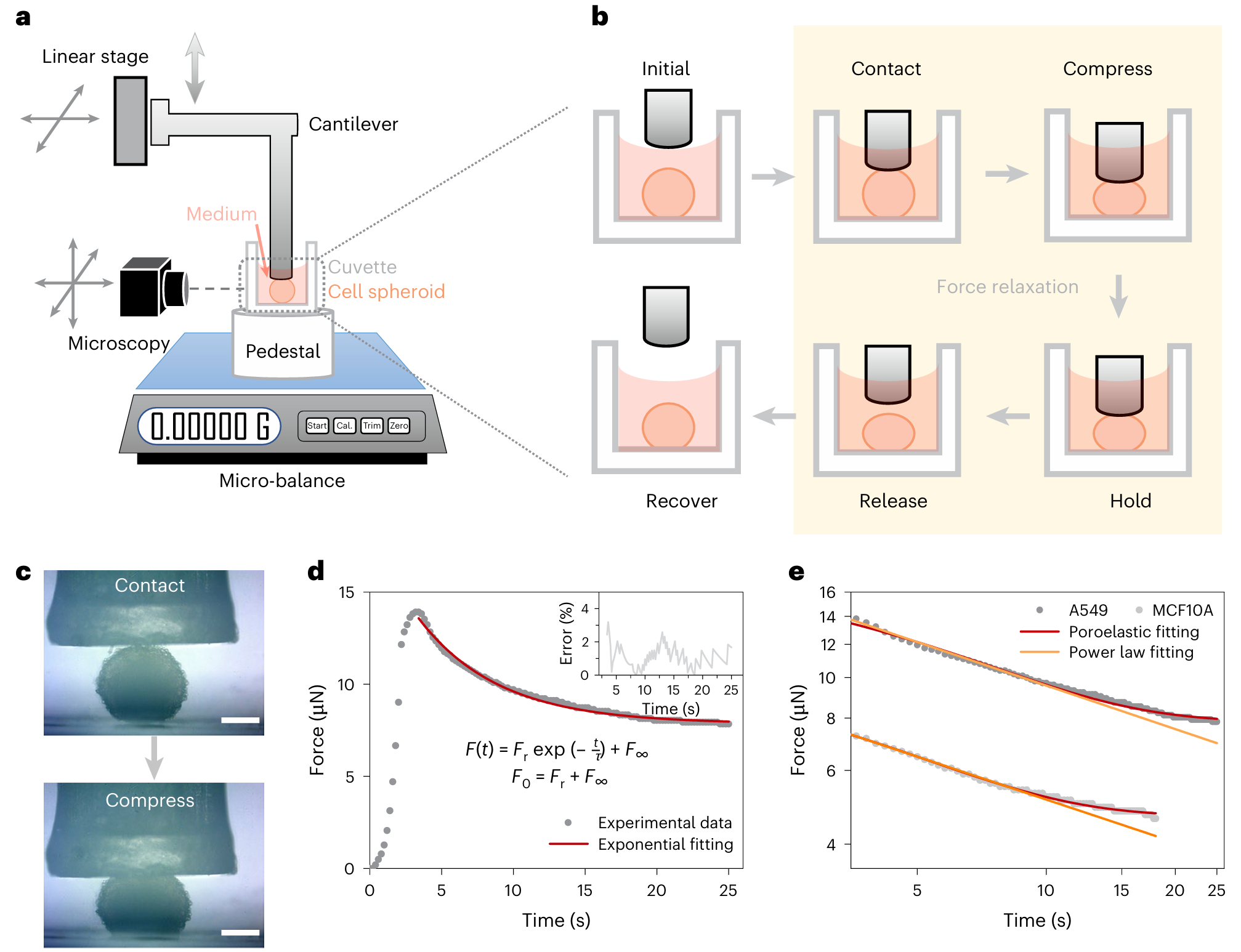 为了精准探究这一问题,研究团队自主设计并搭建了一套高精度的微尺度生物力测量平台(专利申请号:202410313368.7),其能够对三维生物组织施加精确的力学压缩,并实时测量其力学响应。