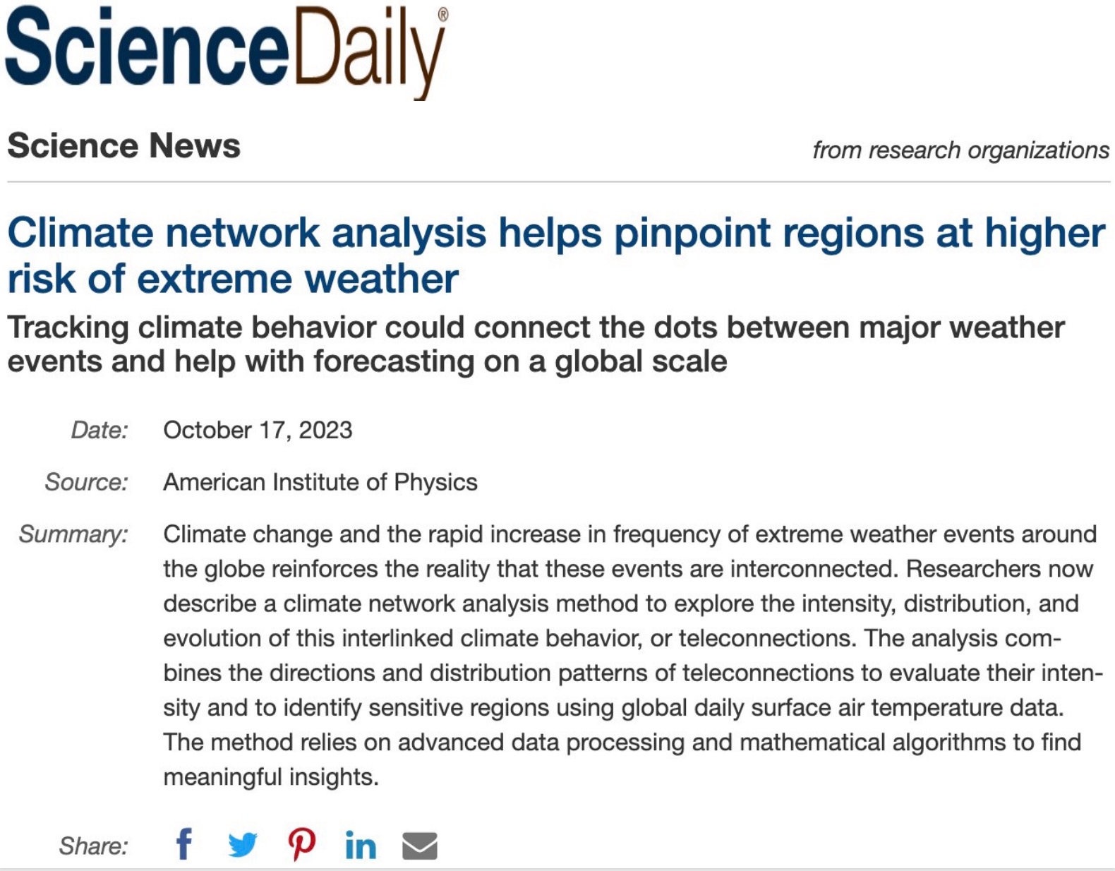 鉴于工作的重要性,论文被选为编辑推荐Editor pick文章,推荐文章Chaos每年仅约20篇,并被美国物理联合会(AIP)编辑推荐新闻记者采访并报道,相关内容以“Tracking climate behavior could connect the dots between major weather events and help with forecasting on a global scale.”为题刊登在AIP官网发表:。 同时,美国《每日科学》(ScienceDaily)也报道了此项工作(见图3)。《每日科学》是美国科普文章专题新闻网站,与Nature、Science、Discovery、Scientific American等同列为十大科学网站,详情请见:.