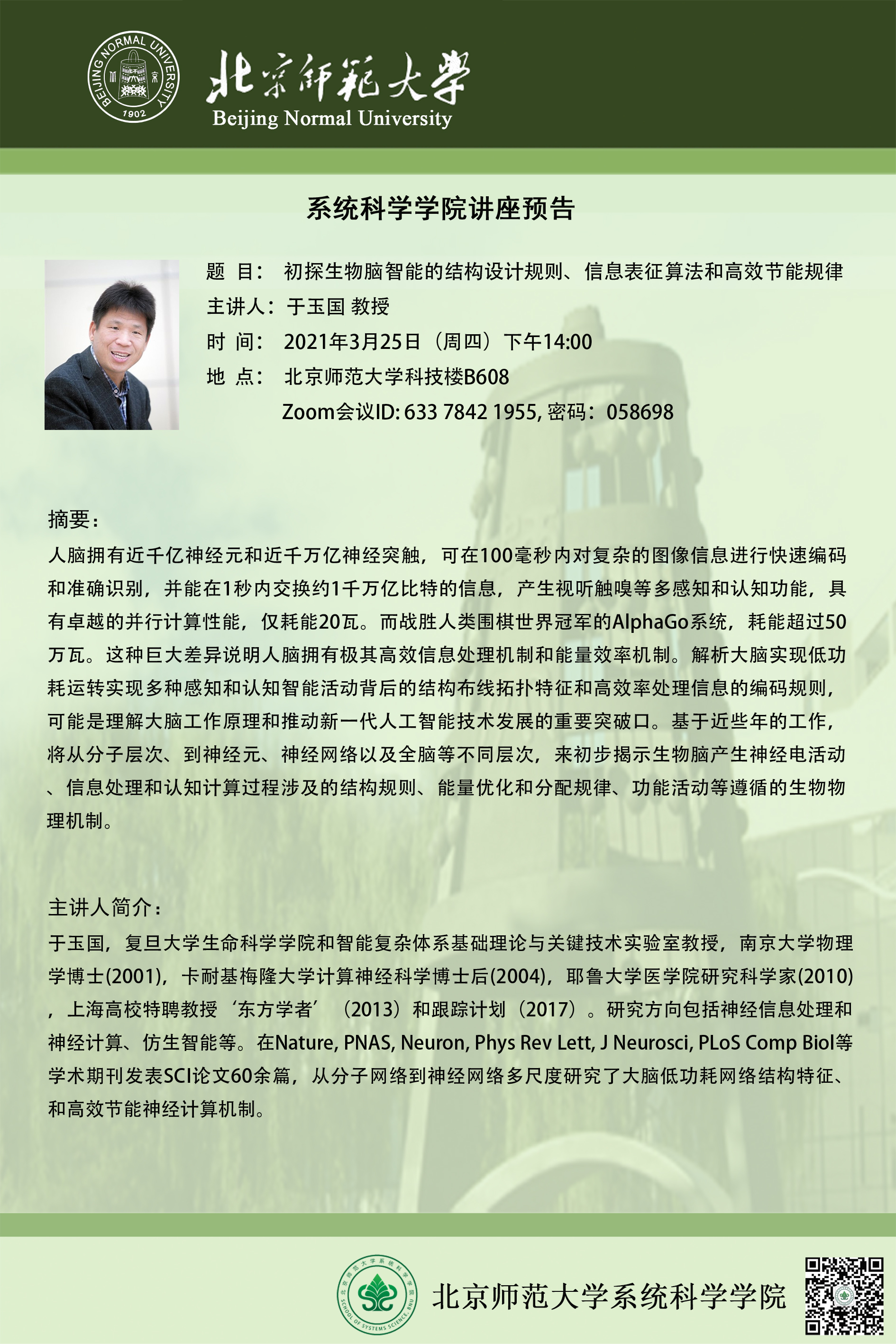 【讲座】初探生物脑智能的结构设计规则、信息表征算法和高效节能规律