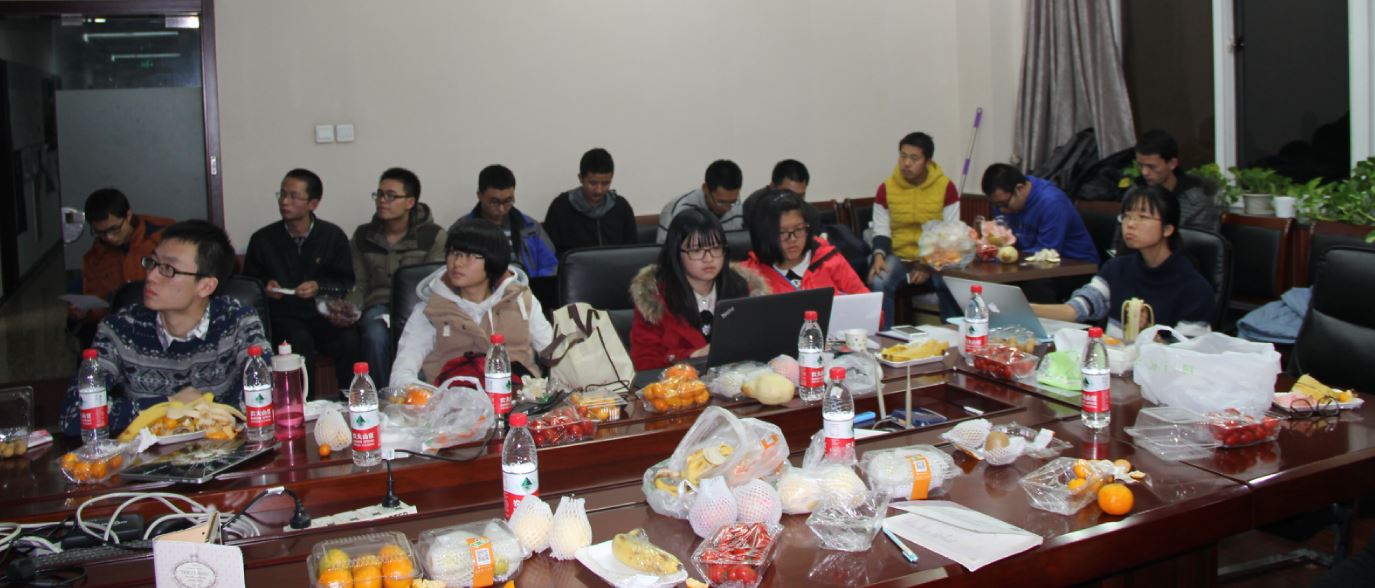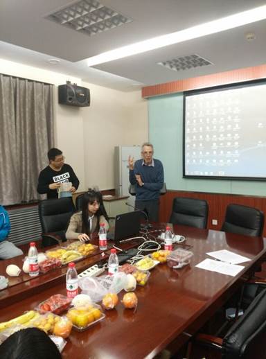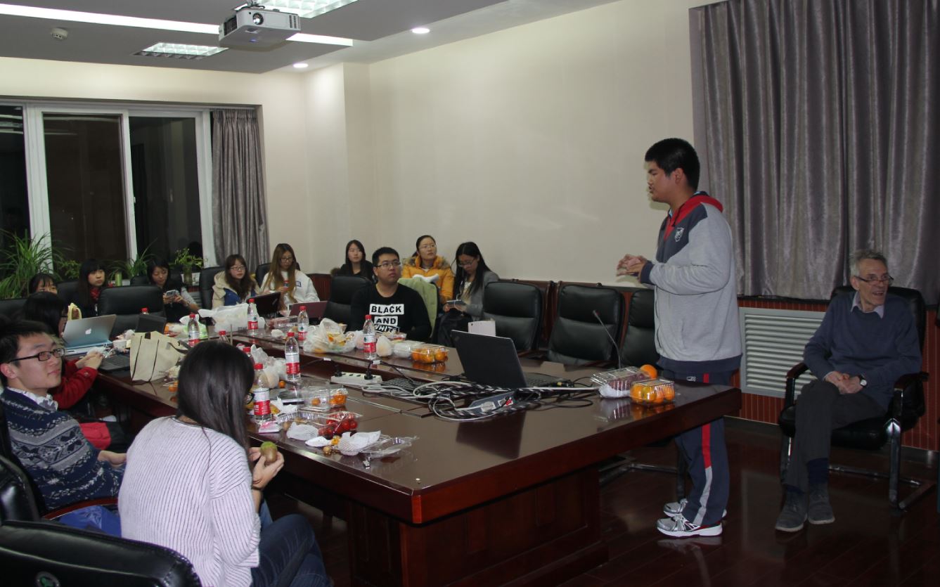 作为整个竞赛活动的一个环节,11月13日(周五)晚上19:00在英东楼217组织了以“吃喝玩乐”为主题的实验科学之夜,同学们进行了答辩热身,相互交流了研究的成绩,有的还做了现场实验。流利的英语表述和丰富的结果得到了Roehner教授的称赞。下面是一些实验之夜的现场照片。