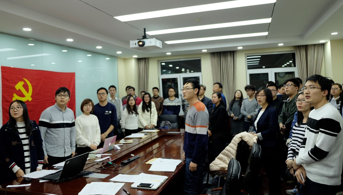 大会开始之后,首先全体起立,唱国际歌。然后根据接受预备党员会议流程,三名发展对象逐一宣读了入党志愿书,表明了自己加入共产党的决心。支部大会讨论过程中,三名发展对象的入党介绍人分别介绍了三位同学在日常学习和生活中的表现以及存在的优缺点,表明三位同学符合党员标准;随后支委会报告了对发展对象的审查情况;与会党员发表意见的过程中,在场的教师和同学除了对三位发展对象的日常表现做出肯定之外,还向三位发展对象提出了很多问题,比如狄增如老师提到“如何看待党的发展中经历的许多挫折和磨难”,蔡维老师提到“结合十八大召开的背景,有没有感觉现在入党是一个入党的好的时机”等,三位发展对象认真的回答了这些问题,这些问题也引起了在场党员们的思考。随后正式党员投票表决,最终组织委员刘艳老师宣布支部决议,三名同学正式成为预备党员。