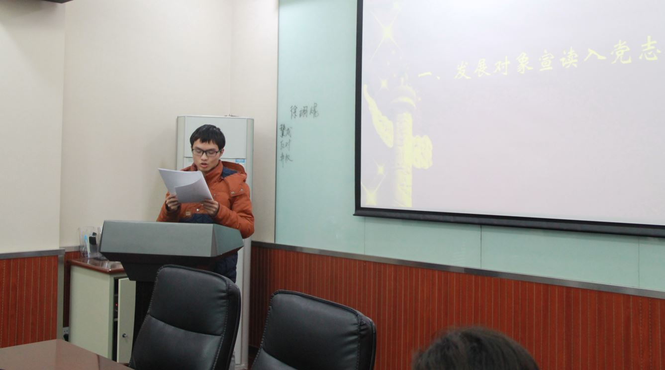 大会第二项内容,支部为徐翊焜同志进行接受预备党员会议。本次会议由支部书记马玉财主持,继全体党员起立歌唱国际歌之后,徐翊焜同志宣读了入党志愿书,并由入党介绍人战笑然同志对其在入党积极分子期间的表现及教育、考察情况进行汇报。支部生活委员马榕同志汇报徐翊焜同志的政审情况,其家庭主要成员和联系密切的主要社会关系清楚,经考察,徐翊焜同志在政治上积极要求进步,靠拢党组织,并经常主动向党组织汇报思想、工作和学习情况,虚心接受党组织的指导,能以共产党员的标准严格要求自己,已基本符合党员条件,政审合格,建议党组织发展其为中共预备党员。支部成员张琪同志说,徐翊焜同志作为科研小组成员,积极参加组里面的各项活动,干活非常认真。曾凡齐同志说,徐翊焜同志作为学院研究生会主席,为学院发展做出了贡献,积极联系外院研会组织活动。希望其以后做科研能够坚持下来,坚定信心。通过支部大会全体支部成员大会讨论及投票表决,徐翊焜同志发展成为中国共产党预备党员。新预备党员徐翊焜同志发表了自己的感想,他说很高兴能够成为中共预备党员,会更加严格地以一名共产党员的要求规范自己的行为。