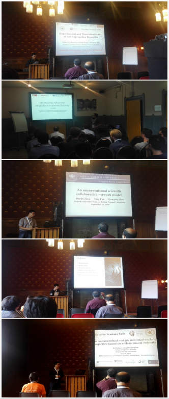 徐翊焜报告题目为“Inferring the model of ants movements and aggregation in circular region”,张琪报告题目“Multiple individuals tracking algorithm for fish in 2D space”,赵一农报告题目“A new measure based on information theory to quantify the co-ordination of fish groups”,周建林报告题目为“A new scientific collaboration network model”。