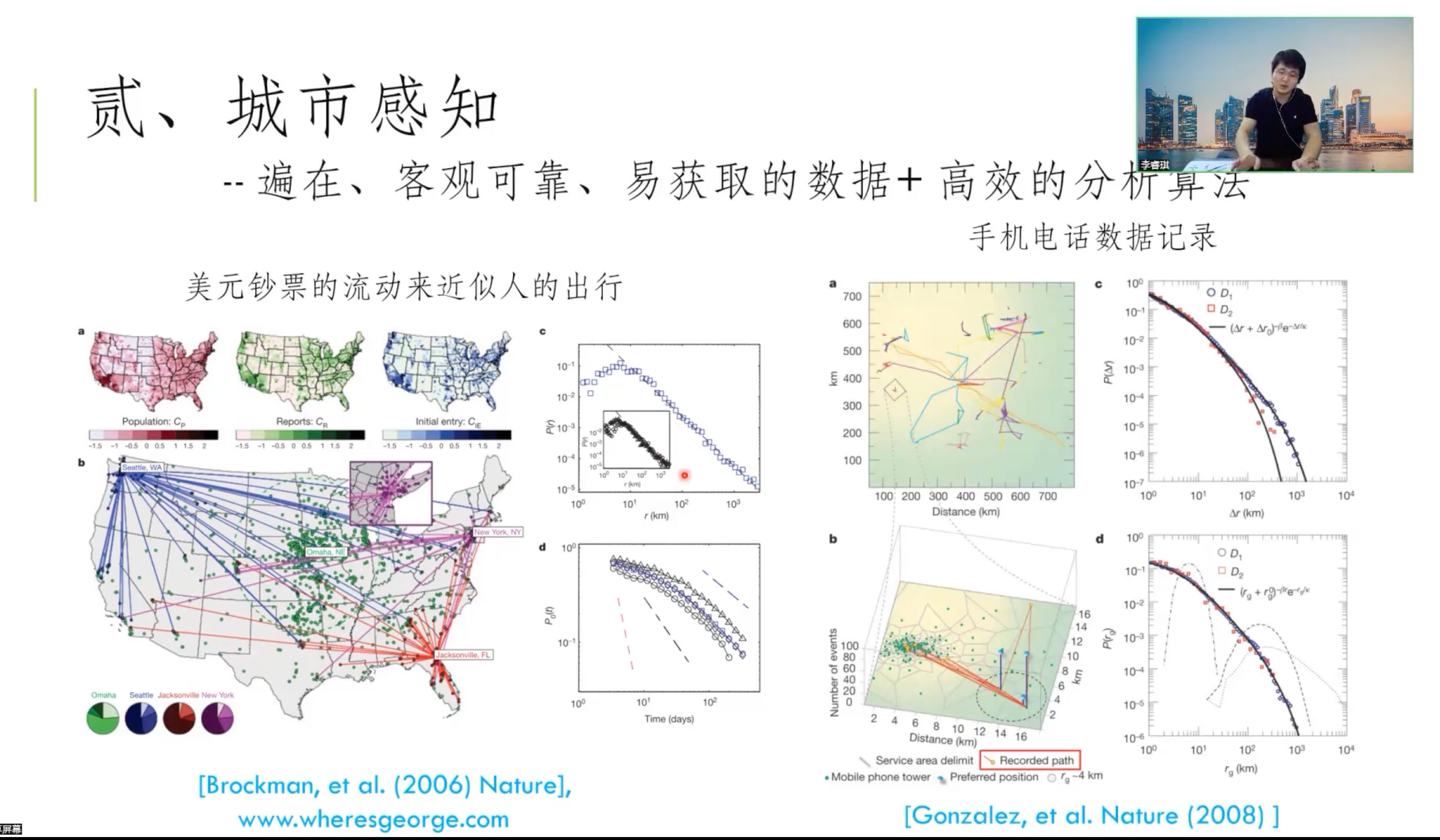 随着各种城市数据的积累,我们能够更好地感知居民的活动,以及整个城市的脉搏。基于手机数据和适当的算法,我们可以得到相对准确的个体轨迹,得到城市OD矩阵和活动人口(AP)分布,可用于评估交通效率,干预疫情传播,预测居民的动态空气污染暴露,更好地进行城市建模。从动态和交互的角度,基于AP概念,构建了一个简单的机制模型,可以解释城市内部和城市间的空间尺度规律的起源。该模型易于修改,可用于研究城市群的协同演化和城市更新。